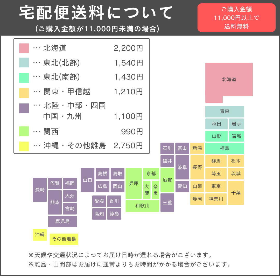 税込金額11,000円以上の場合は送料無料です。 11,000円未満の場合は、宅配便における地域ごとの送料を以下の通り頂戴いたします。